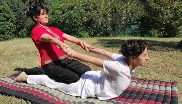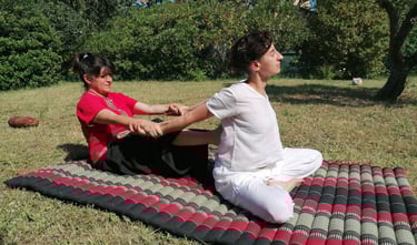 Variante du massage thaï plus énergique, centrée sur l’alignement postural et le travail des lignes d’énergie.
